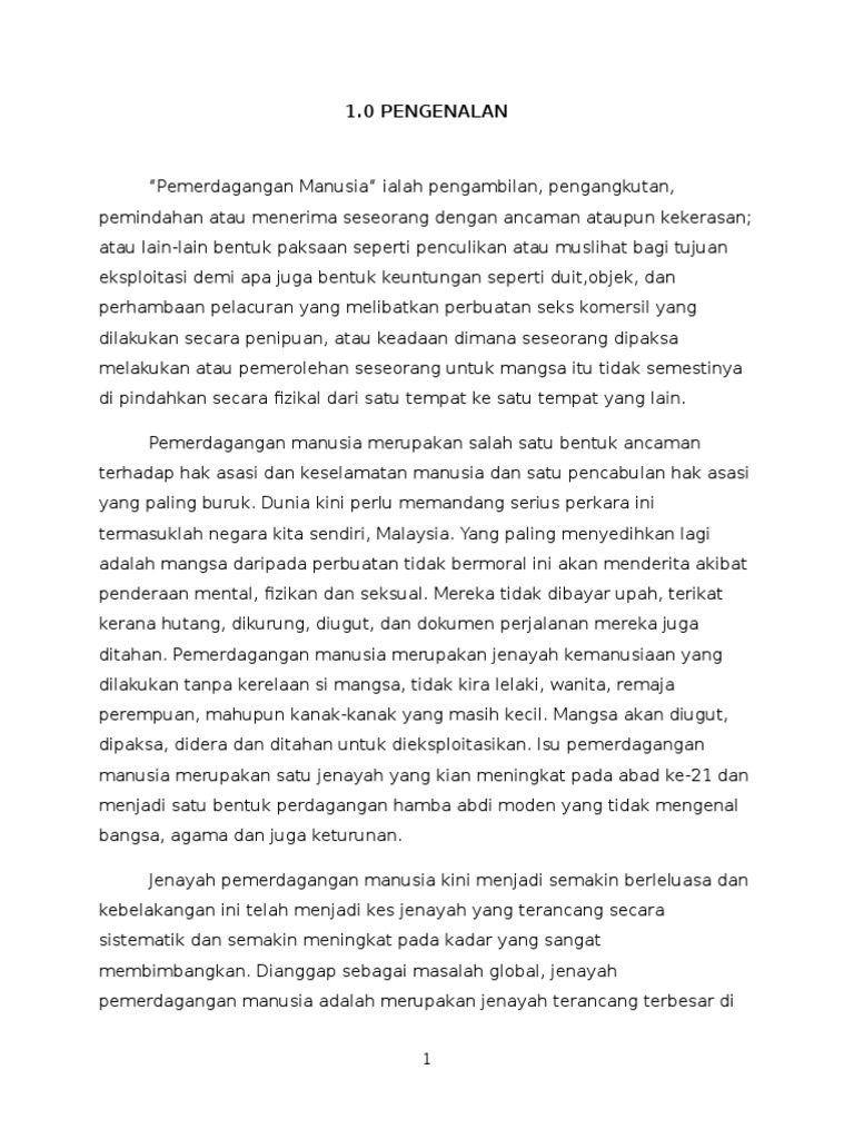 Laporan Pemerdagangan Manusia Trafficking in Persons TIP oleh Jabatan Negara Amerika Syarikat AS telah menganggarkan keuntungan yang berjaya diraih oleh jenayah pemerdagangan orang di negara tersebut mencecah AS1 billion hingga AS3 billion setahun iaitu bersamaan RM35 billion hingga RM105 billion setahun Utusan Malaysia 1 Oktober 2009. Pelajar hendaklah memahami konsep pemerdagangan manusia. Esei 1 isu pemerdagangan manusia dikatakan semakin meningkat di malaysiahal ini sedikit sebanyak telah menjejaskan kedaulatan malaysiabincangkan.